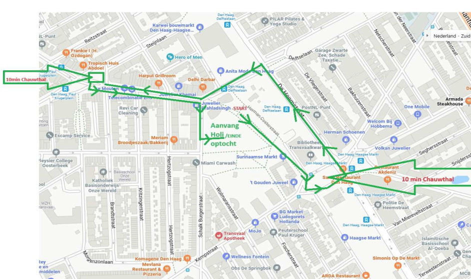 De traditionele holi-optocht heeft dit jaar de volgende route: vanuit het festivalterrein wordt gelopen naar het Hobbemaplein, vervolgens via de De Heemstraat, Delftselaan (links), de Paul Krugerlaan naar het Paul Krugerplein. Na een korte stop op het Paul Krugerplein wordt teruggelopen naar Wijkpark Transvaal. Iedereen mag meedoen aan deze holi-optocht.